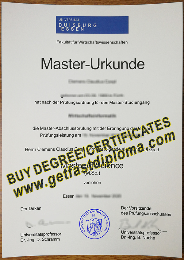 How to get a fake University of Duisburg-Essen diploma. Buy a fake Universität Duisburg-Essen degree, fake the University of Duisburg-Essen diploma. Where to buy a University of Duisburg-Essen diploma and transcript. How much to order a University of Duisburg-Essen degree. How long to get a fake Universität Duisburg-Essen Abschlusszeugnis. The University of Duisburg-Essen is a comprehensive public university in Germany and the world’s top emerging university. In 2003, it was founded by the University of Duisburg (Gerhard Mercator Universität Duisburg) and the University of Essen (Universität Gesamthochschule Essen) was merged to form one of the largest universities in Germany, with campuses located in Duisburg and Essen.